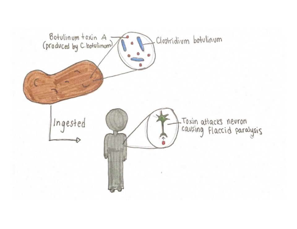 Foodborne botulism is a paralytic disease caused by ingestion of food contaminated with Clostridium botulinum and the botulinum toxin (BoNT) that this bacterium produces. As illustrated in Figure 2, one only develops the symptoms of botulism when they ingest the toxin. On its own, Clostridium botulinum will not cause this disease. The bacterium, which is ubiquitous in the environment, is anaerobic (meaning they grow in the absence of air) and spore-forming. It is called a spore-former because it develops a “shell” which is capable of protecting the cell under adverse conditions such as extreme heat, dryness and exposure to chemicals. C. botulinum normally grows in soil or in lake sediments and, as mentioned, is itself often harmless to the human body. However, the botulism disease will occur when its spores have the chance to germinate in foods, leading to bacterial growth and production of the botulinum toxin. This toxin specifically targets the nervous and muscular systems, causing muscles to go limp all over the body. Symptoms of botulism may include double or blurred vision, drooping eyelids, slurred speech, difficulty swallowing and muscle weakness that radiates down the body. In more extreme cases, botulism can result in death due to respiratory failure.