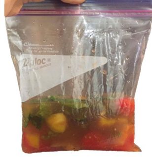 Figure 3: A sealed plastic bag containing water, honey, potatoes, apples and tomatoes to be fermented for hooch production. Source: Elyse Perrault & Hailey Pelland (2017).