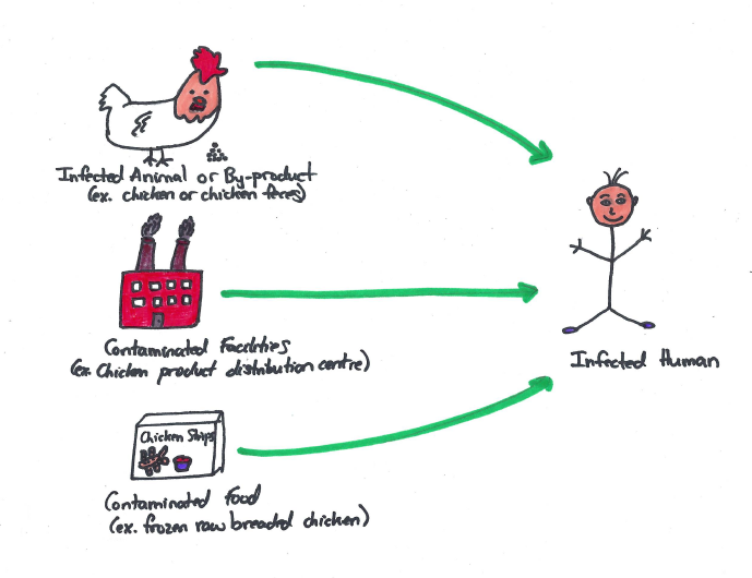 According to the Public Health Agency of Canada, outbreaks of S. enteritidis can be caused by contact with infected animals and surfaces and ingestion of contaminated food (See Figure 2). Interestingly, S. enteritidis infection is especially a problem among poultry, as the bacteria colonize the reproductive tract of hens. Thus, the interior of eggs become colonized prior to shell formation. Furthermore, chickens occasionally ingest either their own or other chickens’ feces that may contain the pathogen promoting transmission. Accordingly, ingestion of contaminated food is the cause of the outbreak under discussion as the frozen raw breaded chicken contained the pathogen. In 2009, Dominguez and Schaffner demonstrated that S. enteritidis is able to survive under freezing conditions (- 20 °C) for almost 16 weeks explaining why frozen food is a source of outbreak. Moreover, infected individuals do not cook the meat properly, allowing the bacteria to survive.  Other causes of contamination include unsanitary distribution management and antibiotic resistance. Antibiotic resistance is partially responsible for S. enteritidis outbreaks as with increased resistance, there are more cases of salmonellosis which consequently increases the risk of an outbreak to occur. Interestingly, in 2018, Nair et al. explained that after the approval and increased usage of fluoroquinolones, serotypes acquired resistance to the antibiotic. In support of this claim, they showed a positive correlation between cases of Salmonella Heidelberg infection in Canada and antibiotic resistance. Overall, several factors contributed to the initiation of the S. enteritidis outbreak.
