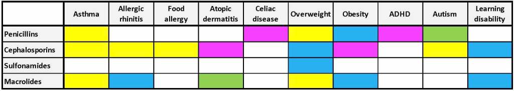 Overall, Aversa et al. (2021) found a significant association between exposure to certain antibiotics and increased probability of developing many health conditions. Specifically, obesity, asthma, allergic rhinitis, atopic dermatitis, ADHD and learning disabilities were among the most common health problems in kids exposed to two or more antibiotics.